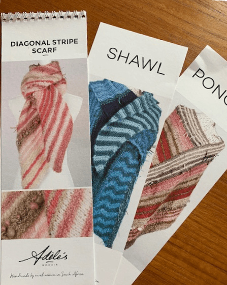 9 balls of brushed or boucle mohair and 3 balls of textured yarns with a ball of mohair ribbons, beads and wobbly yarn. Included in the pack are 3 patterns, 1 scarf, 1 shawl and 1 poncho. This pack will make any one of the 3.